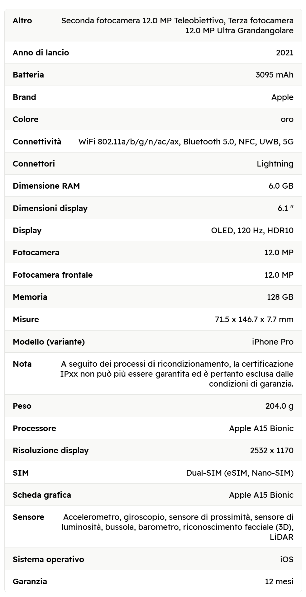 Su l’iPhone 13 Pro è più sostenibile e più conveniente del nuovo. In più è dotato di garanzia min. 12 mesi, 30 giorni di prova e assistenza gratuita, è uno smartphone di qualità controllata dai nostri esperti e quindi più sicuro rispetto all’usato.