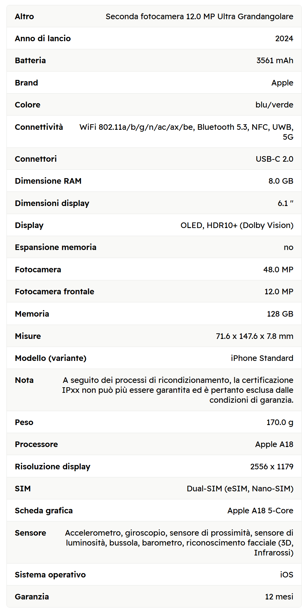 Refurbished – iPhone 16 /128Gb / Teal (Verde)